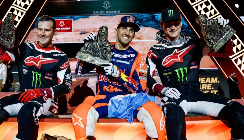 Después vendría el amargo epílogo, en el que tuvo que conformarse con su cuarto podio en siete años, acompañado por un Tosha Schareina que repite presencia en el cajón (aunque baja un escalón) y que consiguió hasta tres victorias de etapa; pero que se vio apeado de la batalla por ganar el Dakar en un error tonto de procedimiento que le costó diez minutos.