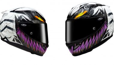 Los diseñadores de HJC han ido más allá del contraste tradicional en blanco y negro, integrando acentos audaces en tonos morado y amarillo que amplifican la presencia inquietante y misteriosa de Anti-Venom.