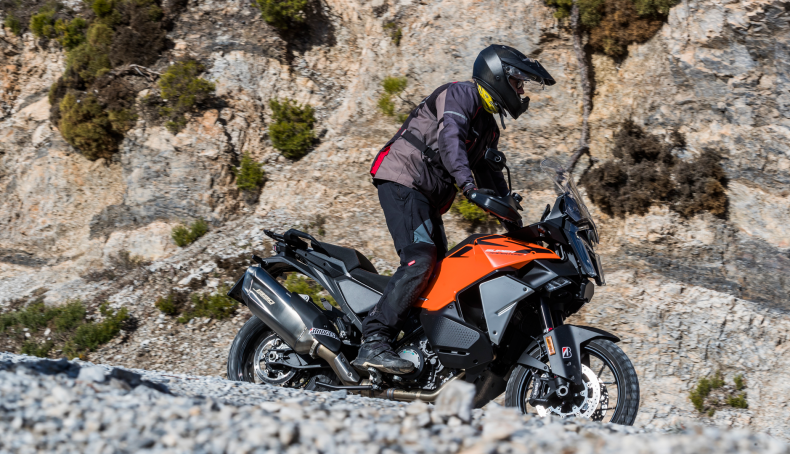 El funcionamiento electrónico de las suspensiones WP permite igualmente ajustar manualmente cada parámetro y hace que en carretera el gran recorrido de las suspensiones, 240 mm y 220 mm, no venga acompañado de movimientos excesivos en los cambios de carga que se producen en frenadas y aceleraciones. Con neumáticos anchos, el agarre en carretera está asegurado, y el motor, dotado de un sistema de distribución variable, siempre tiene par, logrando una efectividad enorme en conducción deportiva, que no está reñida con confort en ruta. El enorme equipamiento de serie en esta versión Evo deja poco espacio a las opciones.