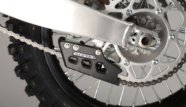 Por esta razón, en los últimos tiempos se han puesto de moda, entre los fabricantes de la industria auxiliar, los guíacadenas plásticos, como el Acerbis Race, que, en caso de ser golpeado, se deforman para luego recuperar su forma; o, en todo caso, se rompen sin afectar a los soportes del basculante.
