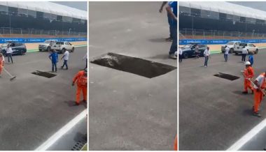 Poco después empezaban a llegar las imágenes de lo sucedido: un 'pequeño' agujero se había abierto en la recta principal del trazado y las labores de reparación han obligado a abrir un enorme foso, dejando un panorama un tanto dantesco.
