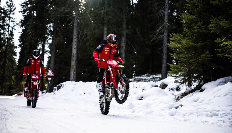 La montura de cross que ambos pilotos tienen para entrenar y a las que se subieron con dos unidades provistas de neumáticos dotados de clavos con los que poder rodar con máximo agarre sobre el camino que llevaba hacia el punto de encuentro con los asistentes al evento.