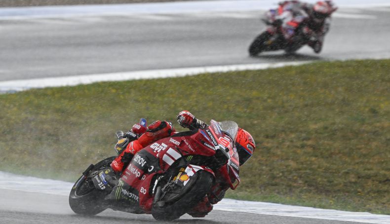 Y es que el de Cervera siempre es capaz de sobreponerse a cualquier circunstancia y ganar en eso que llaman la lotería de la lluvia. Esta vez se le unió la suerte, ya que justo se cayó en la última curva y pudo entrar en el pit lane a cambiar su Ducati, justo en el momento adecuado, cuando más estaba arreciando el aguacero. A partir de ahí, la exhibición el agua, con un hachazo ganador a su compañero Pecco Bagnaia, en la curva Nieto del circuito, delante de una afición que vibró como nunca en un sprint.