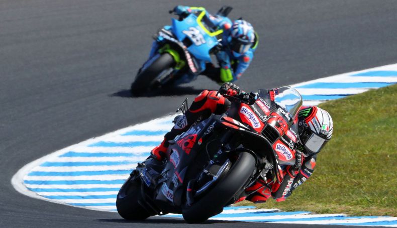 Acosta lo probaba sin éxito con Miller, que empezaba a acercarse a un Álex Márquez que no podía seguir el ritmo de las dos Aprilia. En la quinta vuelta Miller lo probaba con Álex, que se revolvía para defender su posición en el podio ante la mirada de Acosta y un Quartararo que trataba de engancharse, con Fabio Di Giannantonio tratando de llegar tras zafarse de Pol Espargaró.