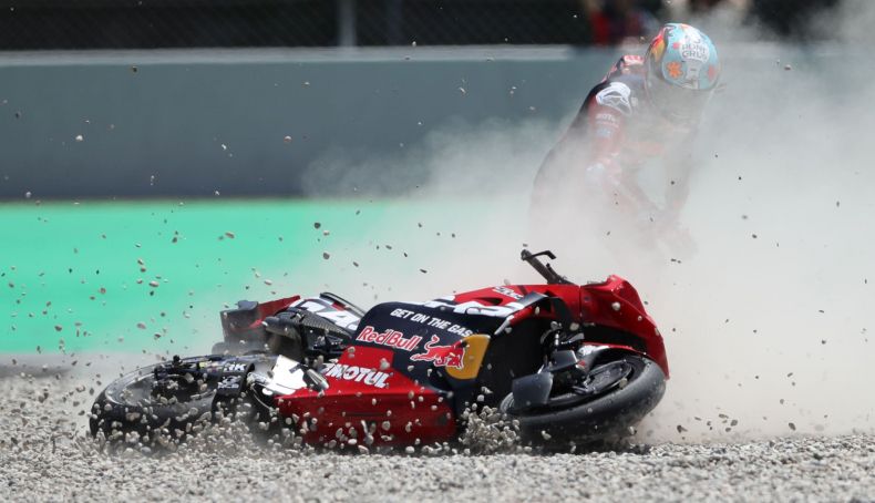 No era una apuesta tan arriesgada como parecía. No era tan loca. Ayer nos tiramos hasta la una de la mañana discutiendo a ver qué hacíamos, no era tan loca. Estaba siendo una carrera de gestión, me ha pasado Martín en una vuelta en la que estaba regulando el freno de delante. Me ha pasado, me he puesto detrás, he estado copiando un poco. He visto que a Pecco quizás le costaba un poco más, quizás estaba gestionando más que nosotros, pero al principio le ha costado un poco más. Y he dicho: bueno, pues me tiro yo también, me pongo detrás de Martín, voy copiando más o menos, sabemos que Martín siempre es uno de los que mejor guarda los neumáticos. Digo: voy copiando las líneas, voy copiando un poco lo que hace con el cuerpo, lo que hace con el gas. Y la verdad es que estaba yendo bastante bien, no estábamos sobrecalentando el neumático. Un poco el delantero yendo detrás de él, pero ninguna barbaridad, estábamos dentro de los límites. Entonces hemos tenido un problema en la parte delantera de la moto, así que es un poco difícil explicar ahora mismo la caída hasta que no lo miremos bien, pero no ha sido ni por el neumático de atrás ni por ir pasado de vueltas.