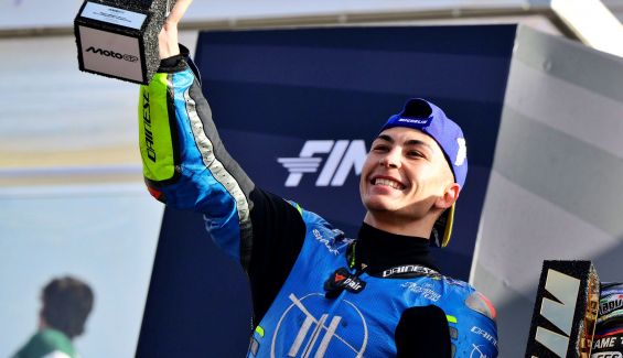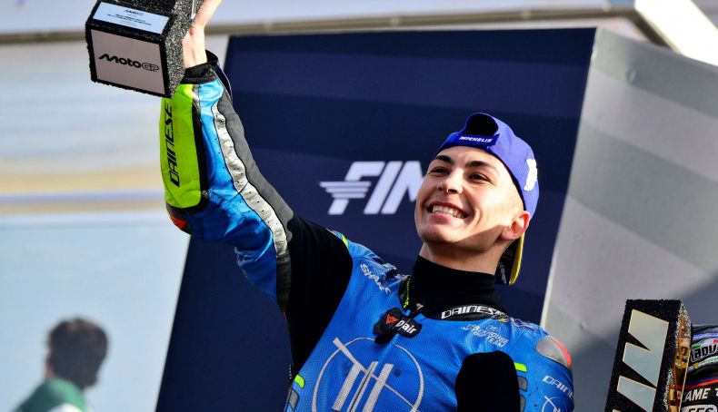 Hoy este podio me sabe mal. Lo he intentado hasta el final, pero había dos curvas que Marco traccionaba en la primera parte un poquito mejor que yo y no podía. Lo he intentado a ver si él cometía un error, sabía que yo acercarme, acercarme a menos de dos décimas no podía; porque había unas partes de curvas que hacía muchísimo la goma. Pero nada, a partir de ahí lo he intentado y este podio se lo dedico a mis padres, que por fin hemos conseguido que mi hermano ganara. Lo ha hecho él solo, pero creo que mucho mérito tienen mis padres de aguantarnos, muchas veces cuando los malos momentos no salen. Así que nada, esto también es parte para ellos, para el equipo, hemos hecho un final de año increíble. Hoy también tengo que decir que gracias a todo el equipo de Quirón he podido correr más o menos al cien por cien. En las últimas vueltas me podía más intentar coger a Marco e intentarlo alguna vez, que el propio dolor, pero es verdad que las últimas cuatro vueltas tenía bastante dolor. En la zona del curvón no podía hacer muy bien el ‘pick up’ porque me dolía un poco. Pero bueno, a partir de ahí lo he intentado. Muy agradecido de terminar el año así. Una lástima Portugal, que creo que era otra buena oportunidad, pero se confirma: la moto está yendo bien, nosotros creo que estamos sacando todo el potencial de la moto, así que muy contento.