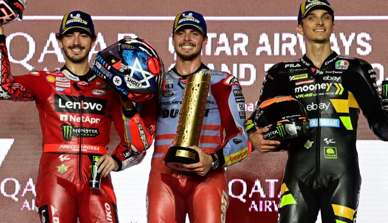Fabio Di Giannantonio, Pecco Bagnaia y Luca Marini en el podio del GP de Qatar de MotoGP 2023 en Lusail