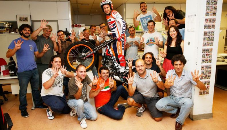 El día después de conquistar su octava corona como campeón del mundo de Trial Toni Bou visitaba nuestras dependencias, la primera vez que lo hacía. Pero no se presentó solo pues vino acompañado de su montura, con la cual accedió, en marcha, hasta el interior del edificio para luego subir con ella por las escaleras. Algo inédito pues jamás había accedido una moto rodando por las oficinas de MOTOCICLISMO. Pero qué mejor ocasión que ésta para marcar ese hito, otro más en la historia de Bou.