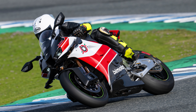 Si estiras el motor hasta la zona roja es cuando sientes todo el potencial de la KB998, ya que sube rápido de vueltas y entrega esos 200 CV con ganas. En esta prueba hemos montado el slick Pirelli Diablo Superbike en compuesto SCX detrás, que tiene un agarre increíble y que ha hecho que apenas hiciese falta la acción del control de tracción. Así que podías salir de las curvas prácticamente “gas a tope” sin ninguna reacción extraña. El cambio KQS te permite subir y bajar y de marcha sin embrague, con lo que puedes pilotar con el agresivo estilo que requieren las Superbike actuales sin el más mínimo problema. Y esto hace que esta Bimota sea una moto muy divertida y rápida en pista.