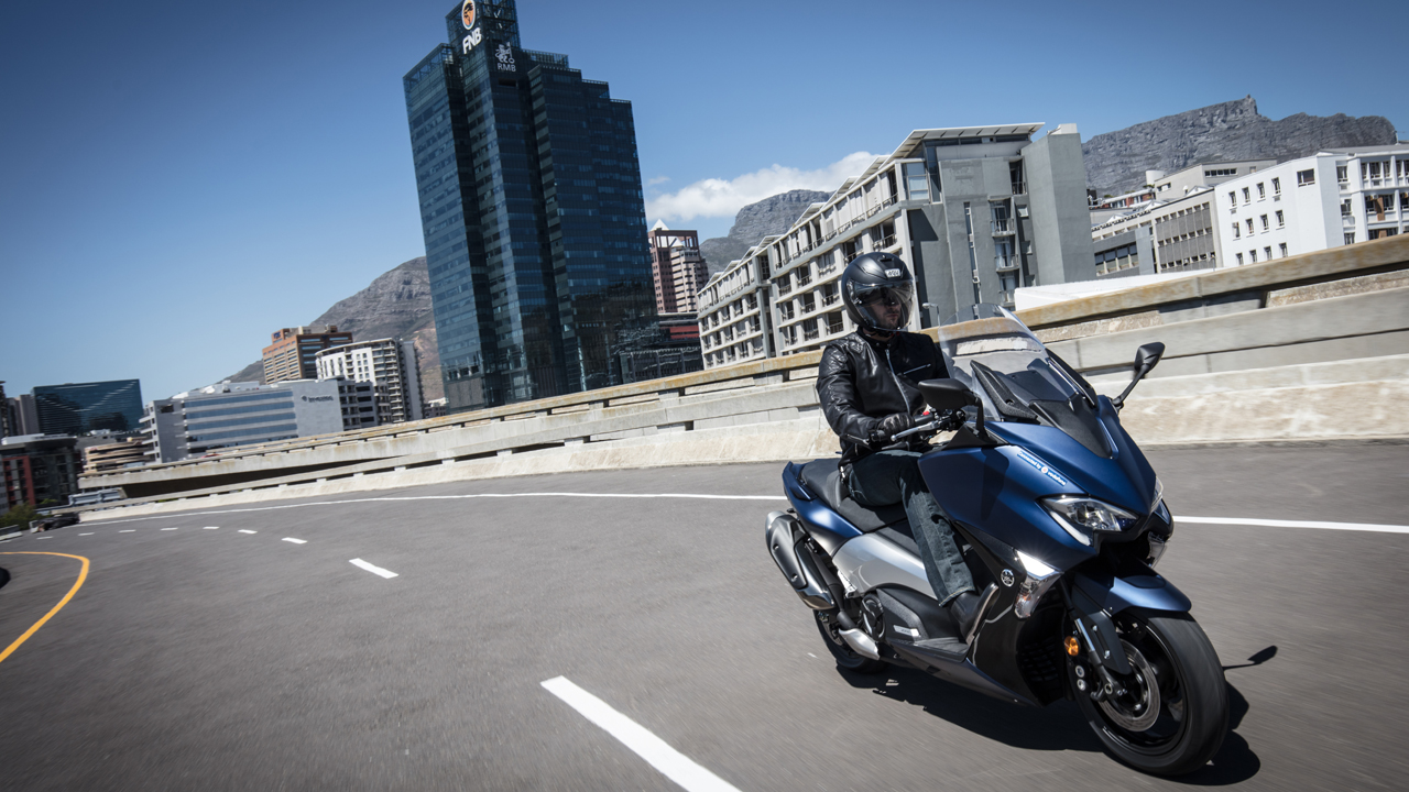 La potencia sigue rozando por debajo el límite de los 35 kW, lo que lo convierte en un vehículo A2 perfecto. Pocos van a echar de menos prestaciones puras, porque la gran ventaja de este modelo es precisamente su equilibrio dinámico. Los kilos de menos se notan, pero también la evolución del chasis y las suspensiones. Para esta primera toma de contacto Yamaha ha elegido ni más ni menos que Sudáfrica, y sobre los baches de las carreteras de la costa sur de Ciudad del Cabo, el TMax pasaba como si fuese una alfombra, sin desviarse de la trazada, sin sacudir la dirección, ni tampoco dar sacudidas a sus ocupantes, algo realmente difícil de encontrar en un scooter por muy elaborado que esté. Realmente, si los anteriores ya eran un prodigio en su compromiso entre comportamiento deportivo y comodidad, esta evolución va más allá. La combinación del funcionamiento progresivo del motor, la ausencia de vibraciones, la fantástica transmisión, y un chasis ligero, ágil y estable es definitiva.