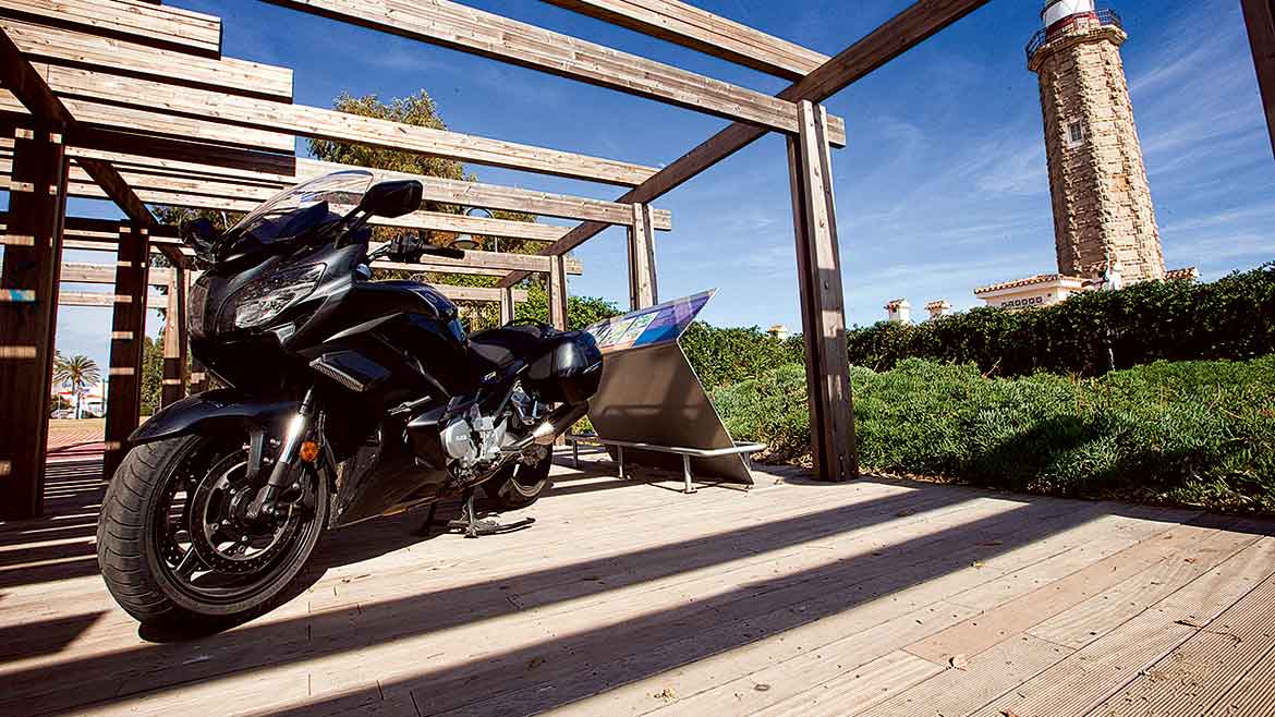 La Yamaha FJR1300AS reposa en Estepona junto al Jardín de Punta Doncella.