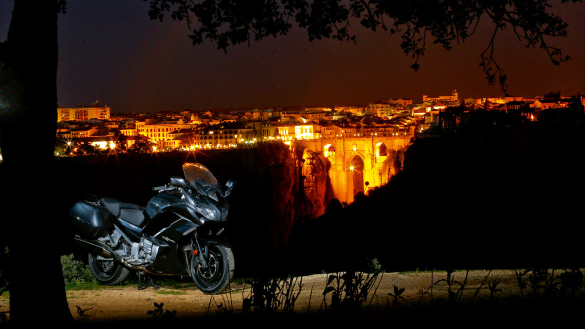 Es cuestión de tiempo dejar atrás toda esa vorágine para comenzar a degustar lo que de verdad buscamos desde hace unos kilómetros: las curvas de la A-397 en la afamada subida a Ronda. El firme agarra lo suficiente como para explorar la estabilidad de la FJR, aprovechándonos de las suspensiones electrónicas de las que ya nos hemos ocupado poco antes de iniciar la marcha. La Yamaha cambia de dirección fácilmente haciéndote valer de la altura de su manillar; y ya que hablamos de altura, la de la pantalla la dejamos al mínimo para sentir, «en primera persona», el viento mientras estiramos segunda y tercera entre curvas redondas, enlazadas, con radio variable… ¡Qué pasada! La línea central es apenas un indicativo para la división de ambos sentidos, por lo que se convierte en discontinua. El tráfico que nos encontramos lo salvamos bajando una marcha y abriendo gas… o ni eso. La tercera es infinita, tanto por arriba como por abajo, por lo que gran parte del tramo «caliente» de subida hacia Ronda lo podrás hacer usando esta marcha, incluso para adelantar en pocos metros.